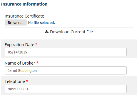 - Click 'Choose File' underneath the Insurance Information section and select an image or copy of your new, valid insurance certificate