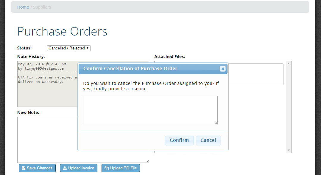 You are required to provide details as to why the Purchase Order is being cancelled or rejected. Once you click Confirm, the Property Manager and the assigned Customer Service representative will then receive an alert with the same details.