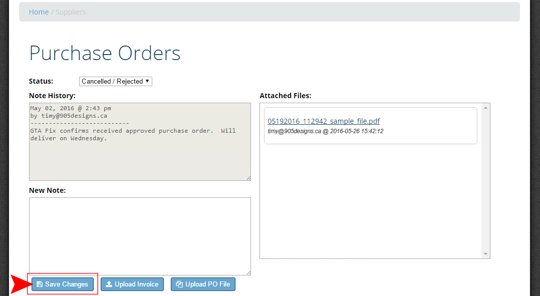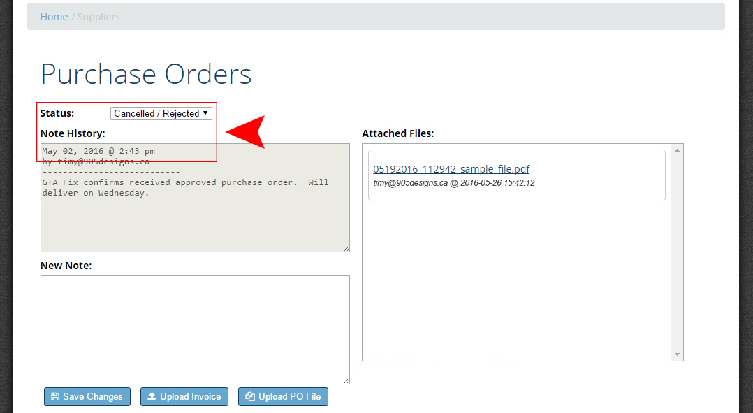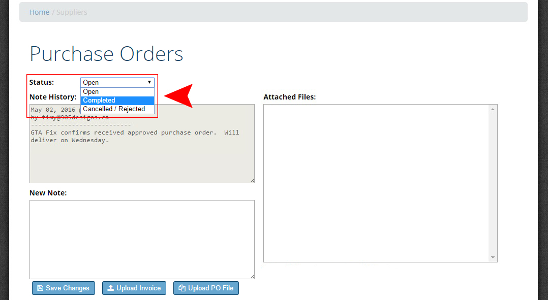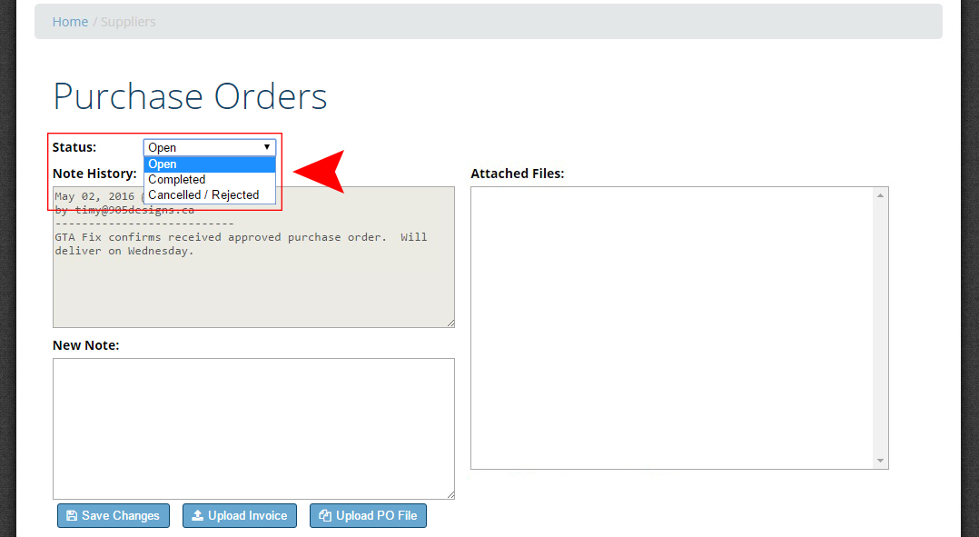 You have the option to reject or cancel a Purchase Order. To do so, click on the drop-down menu beside Status and change the status of the work order to Cancelled / Rejected then click Save Changes.