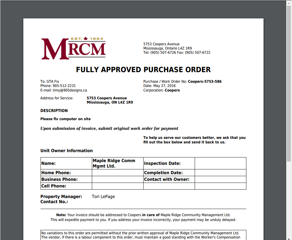 NOTE: As part of the MRCM Approved Supplier Program, all suppliers are required to have insurance. The Certificate of Insurance must list Maple Ridge Community Management, 5753 Coopers Avenue, Mississauga ON L4Z 1R9, as an Additionally Insured Party and as a Certificate Holder.