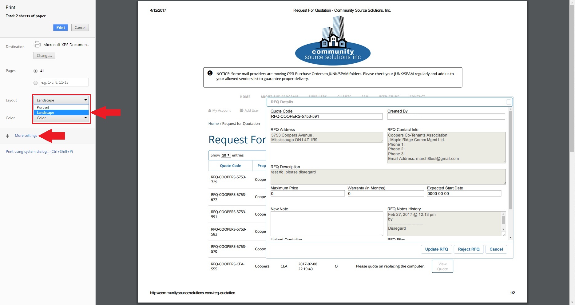 Although it is advised to access your quote through the CSSI website, you can print your quotation for offline usage. Within the CSSI Request For Quotation panel, click on View Quote, and then right-click anywhere on the page and select Print... from the pop-up menu.