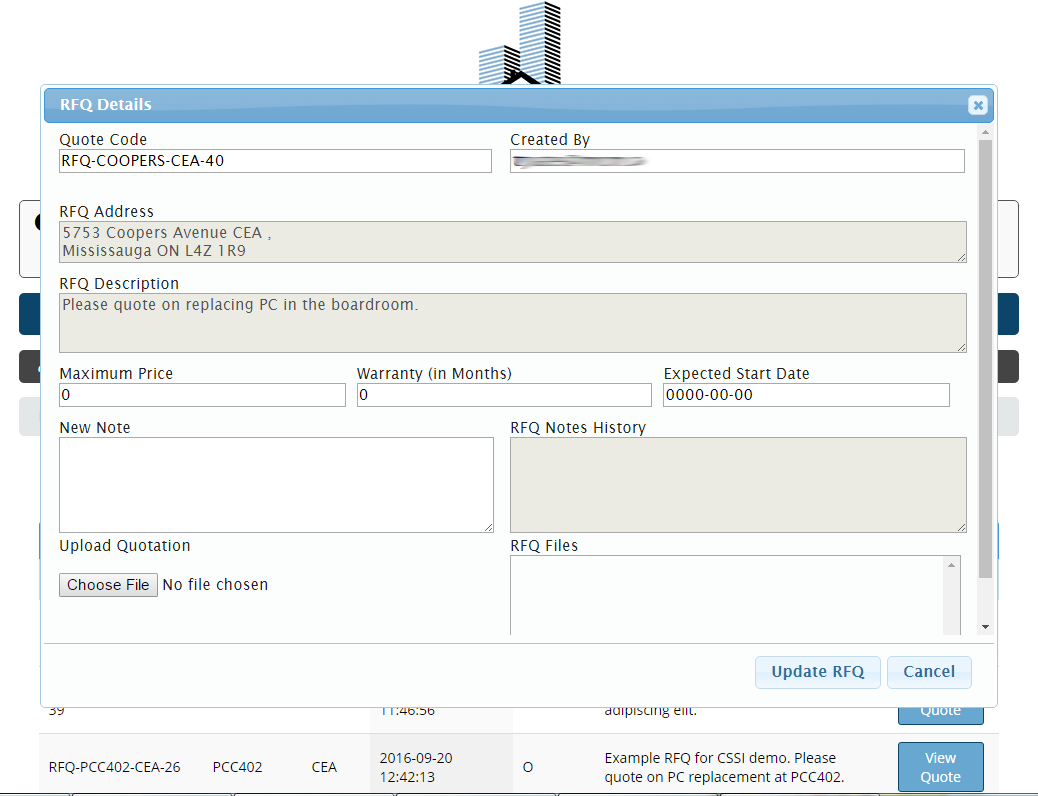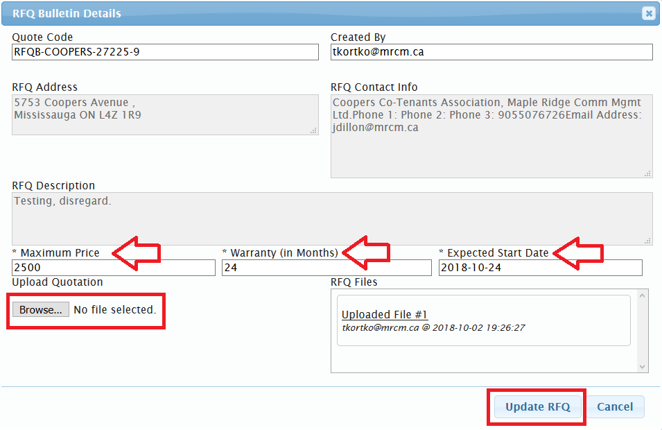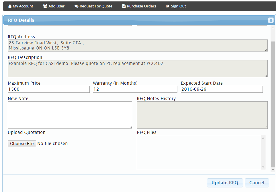 A dialog box will pop-up displaying the details of the selected RFQ. Here you can enter your Maximum Price, Warranty, Expected Start Date, and any other attachments you would like to upload. Afterwards, click Update RFQ to submit your proposal.