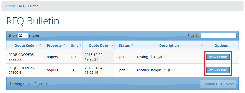 If there are RFQs available within your service category, you will see it listed on this page. To view an RFQ, click the View Quote button beside the entry.