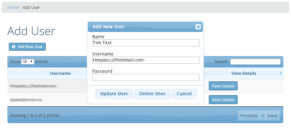 On the master user account, click on Add User to access the user administration panel. Click View Details beside the staff you wish to remove. A pop-up box will appear with their information. Click Delete User.
