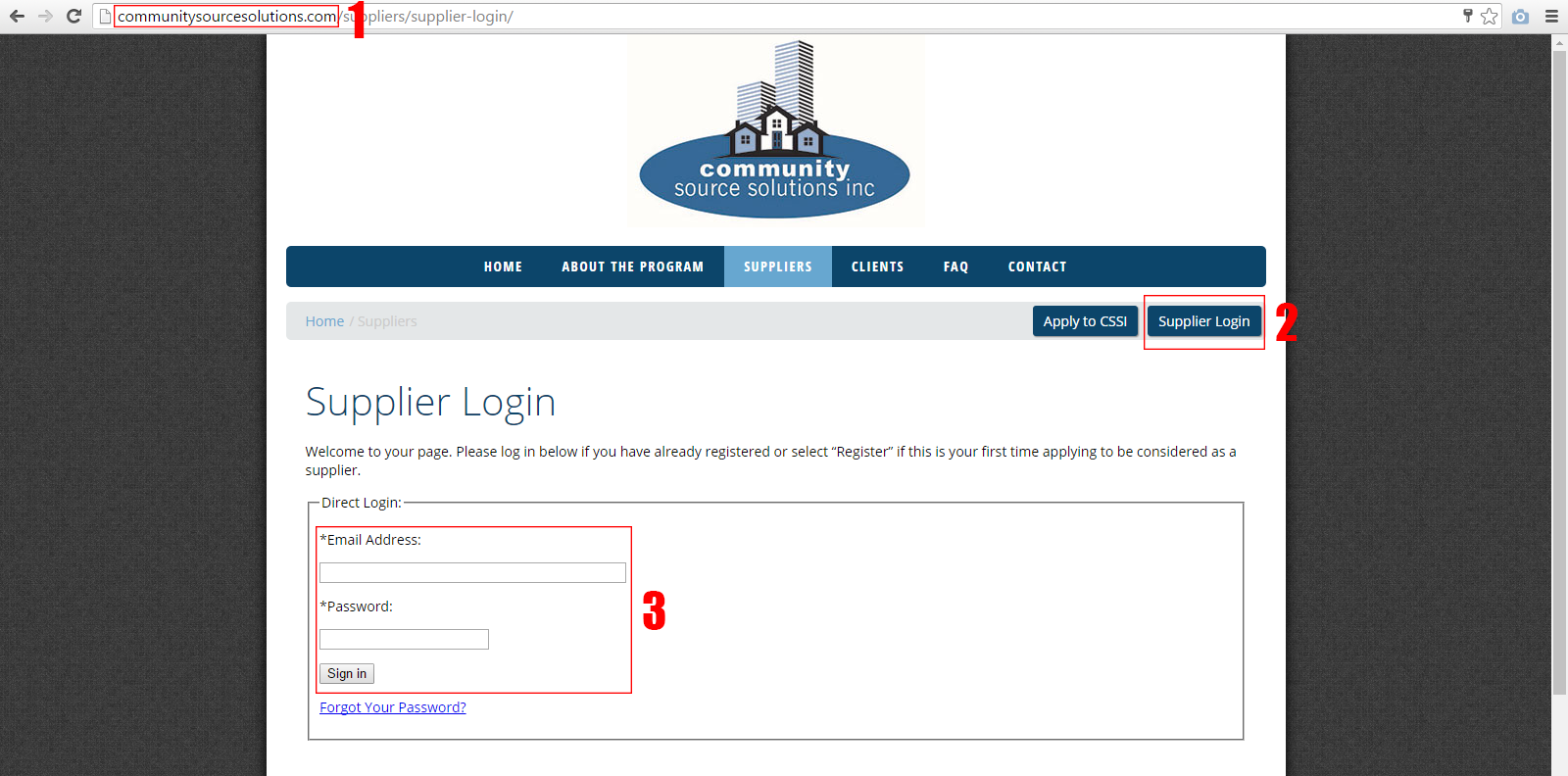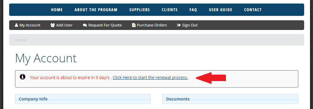Log in to your CSSI primary user profile by visiting http://communitysourcesolutions.com and clicking Supplier Login. Upon logging in, click your ‘My Account’ button on the navigation bar and click the ‘Click Here to start the renewal process’ button beside the red warning text advising you of your expiration time left.