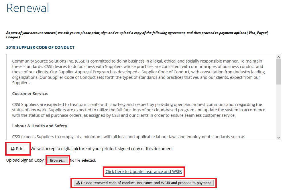 As part of your renewal, you must print and sign and upload a picture or copy of your signed 2019 Supplier Code Of Conduct. You may click the 'Print' button, print the document and sign it. Then upload a copy of your signed document by clicking the ‘Choose file’ button and navigating to it on your computer. An easy way to transfer the document to your computer after printing and signing is to take a picture with a cell phone and e-mail it to yourself.