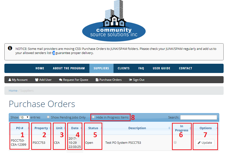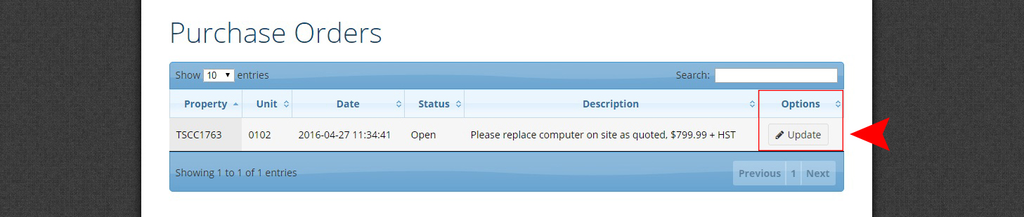 Login, using the steps noted above. Go to your purchase order panel for updates or new assigned jobs. At a glance, you will be able to see the new purchase order assigned, as it will be dated so it will be the latest, most recent date. For more information on the full scope of the purchase order select the Update button and click. Review the full job with all the required information.