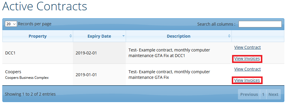 Suppliers are able to view Active Contracts by navigating to the Active Contracts page after signing into their Supplier Portal. This page will provide information on contracts that have been set up between a Property Manager and Supplier. Active Contracts will only be visible once entered by a Property Manager.