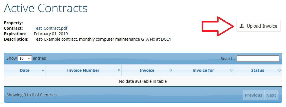 To upload an invoice for a contract, navigate to the Active Contracts page.