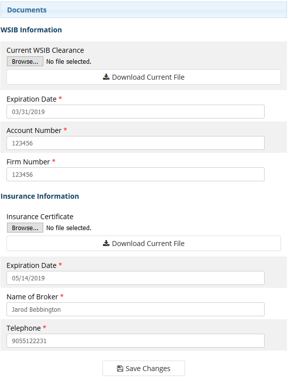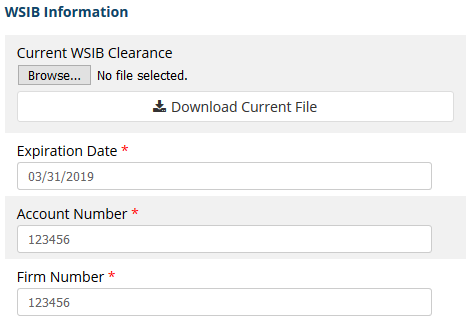 - Click 'Choose File' underneath the WSIB Information section and select an image or copy of your new, valid insurance certificate